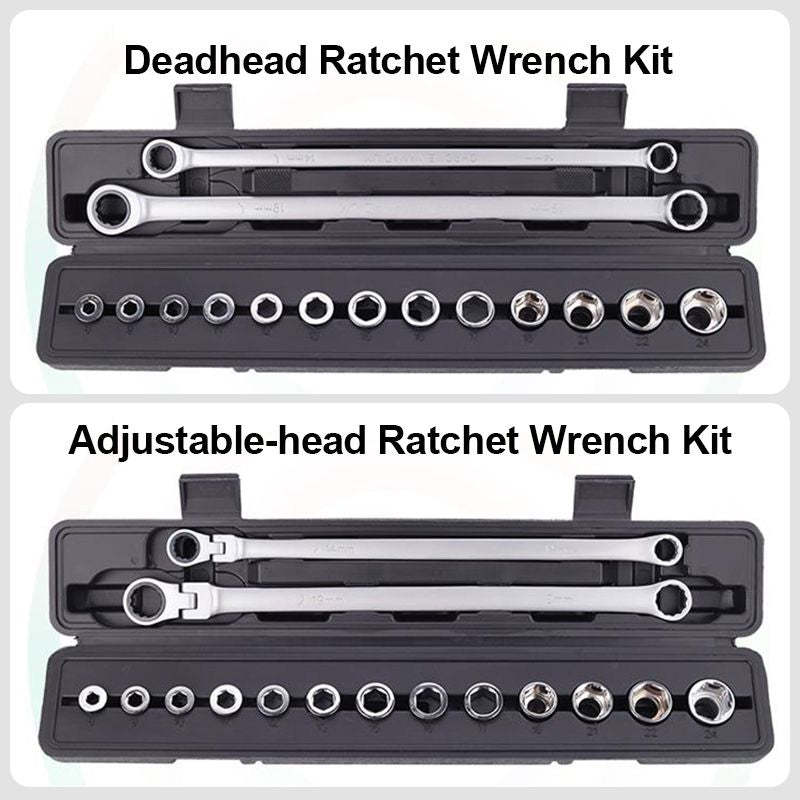 Extra Long Flex-Head Ratcheting Wrench Set includes all 9 sizes of hex heads from 8mm to 17mm and 4 sizes of sleeve heads from 18mm to 24mm.