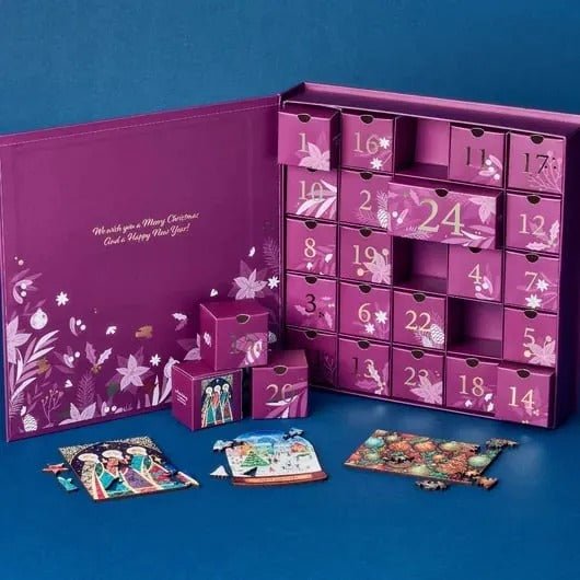 Featuring a variety of popular puzzle designs including our Grid, Free Form and Shaped cuts with whimsies and Extra Difficult puzzles. Including an array of images from different artists our customers love and exclusive Advent Calendar packaging designed by us. This wooden puzzle Advent Calendar will make a unique gift for jigsaw puzzle lovers and a treasured keepsake for years to come.