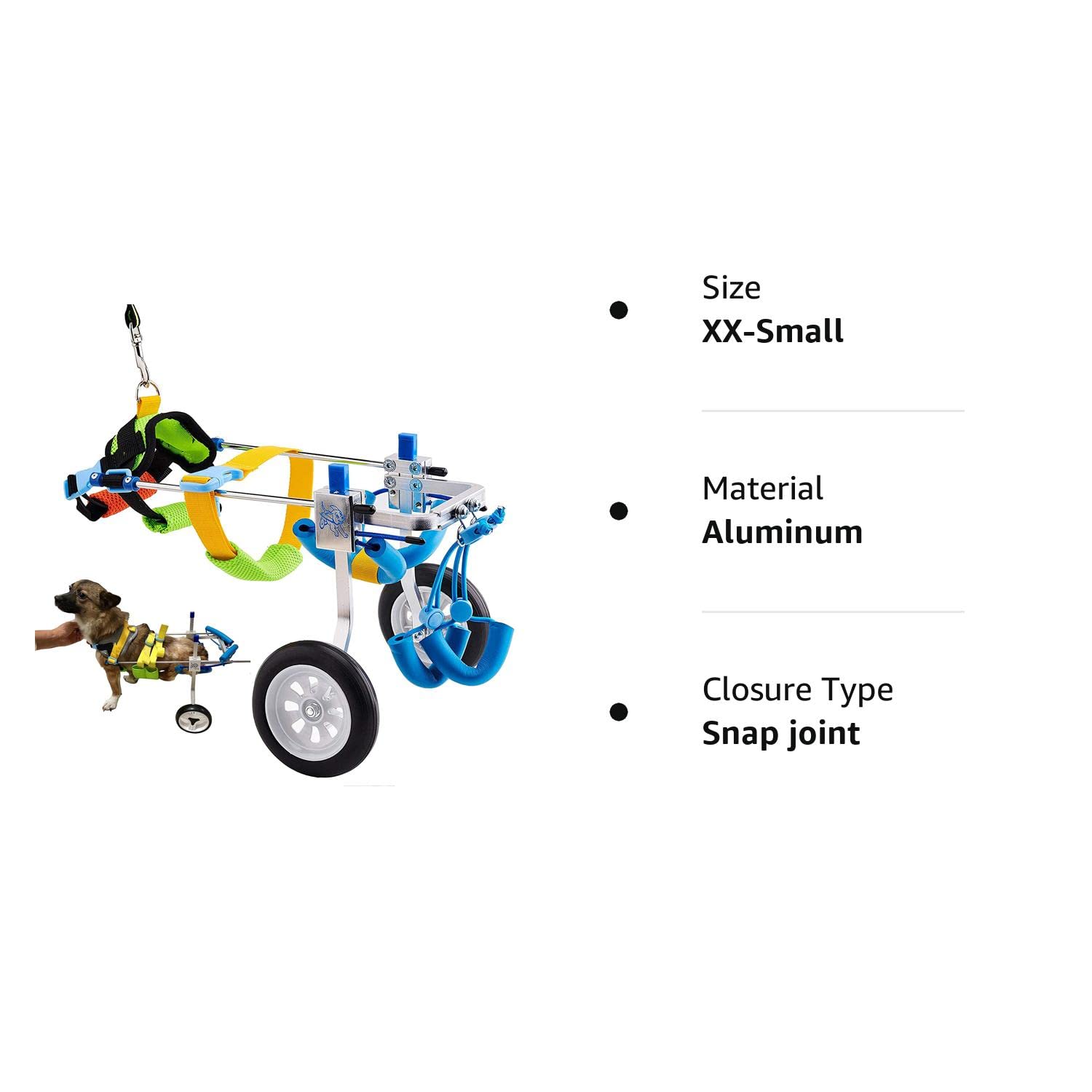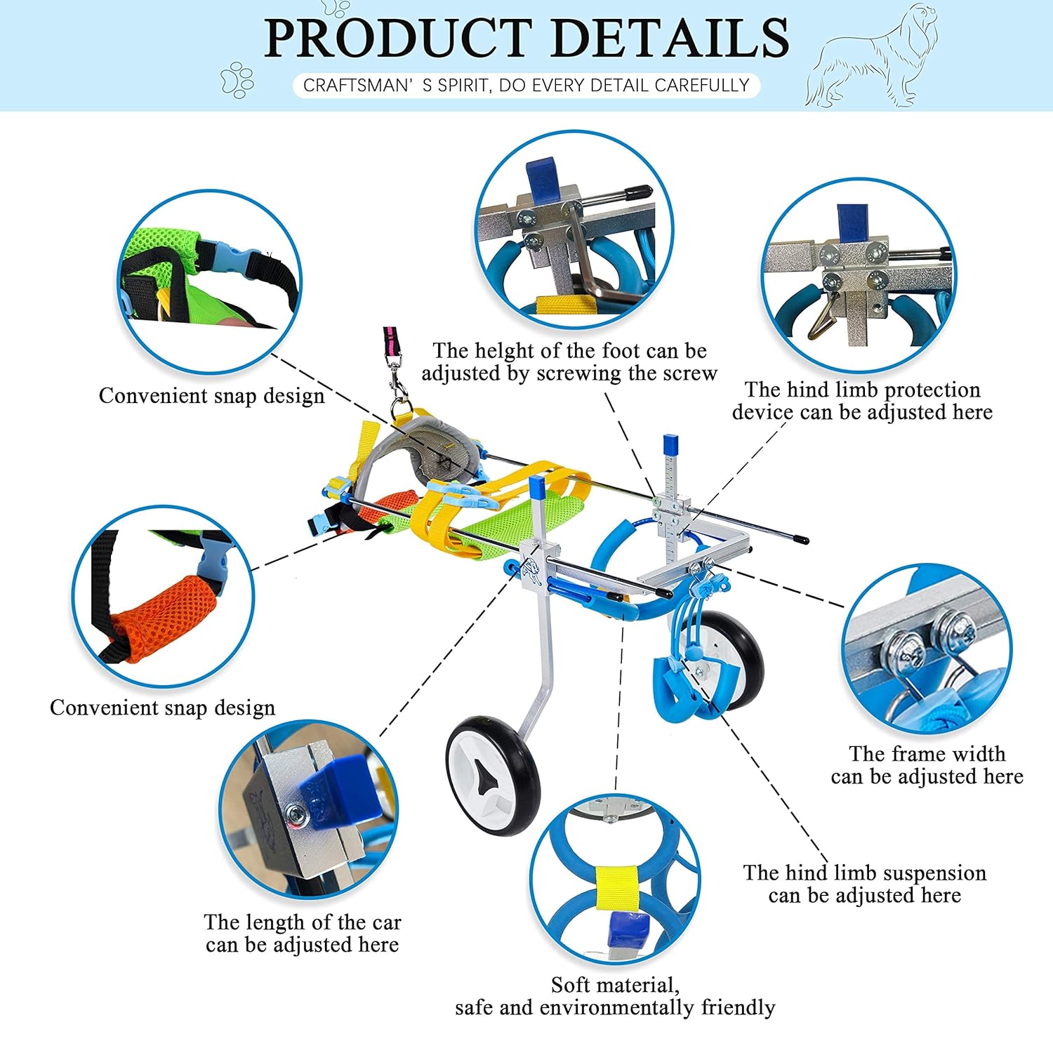 Pet wheelchair height, width and length of this pet wheelchair can be adjusted, and it can adapt to your pet within a certain range. The whole product is easy to assemble, you can install it yourself, and the fordable design is more convenient to carry.Aluminum alloy material, light and strong.
