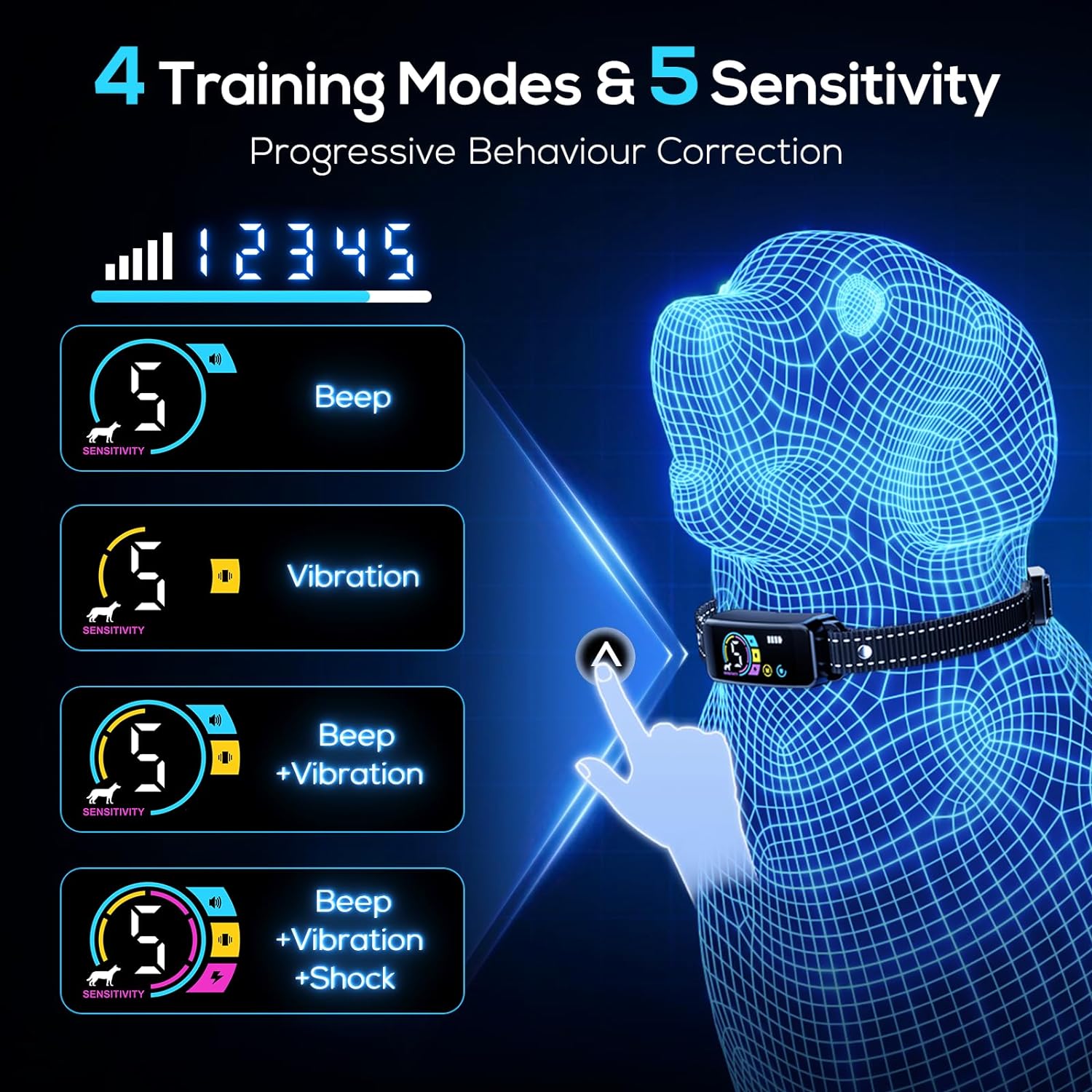 The shock collar provides 4 training modes. No shock mode: beep, vibration, beep+vibration; Shock mode: beep+vibration+shock.5 level sensitivity adjustable, suitable for various environments. Our dog training collar teaches your puppy to relax and trust instead of fear. Achieve effective behavior modification through its customizable training modes.