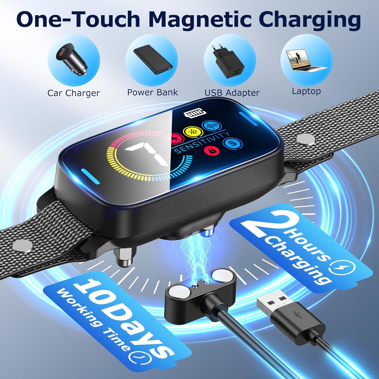 - ⚡Quick USB Charging and Long Lasting: The Doglory dog bark collar charges fully in just 2 hours and lasts up to 10-15 days. It features an intuitive large LED color interface that displays comprehensive information, enhancing its modern, high-tech appeal. The color screen shows the power capacity and low battery reminders, ensuring convenient and uninterrupted use.