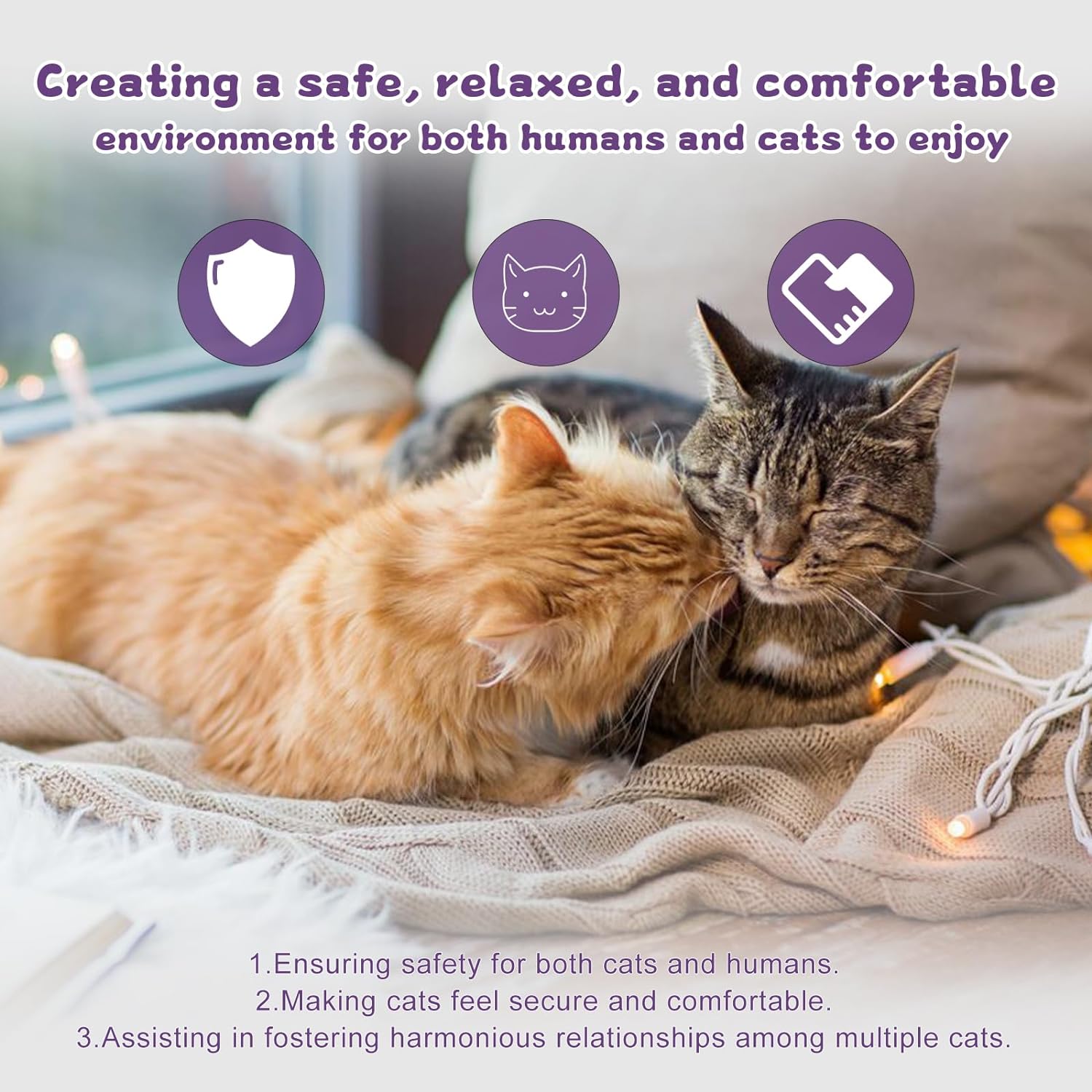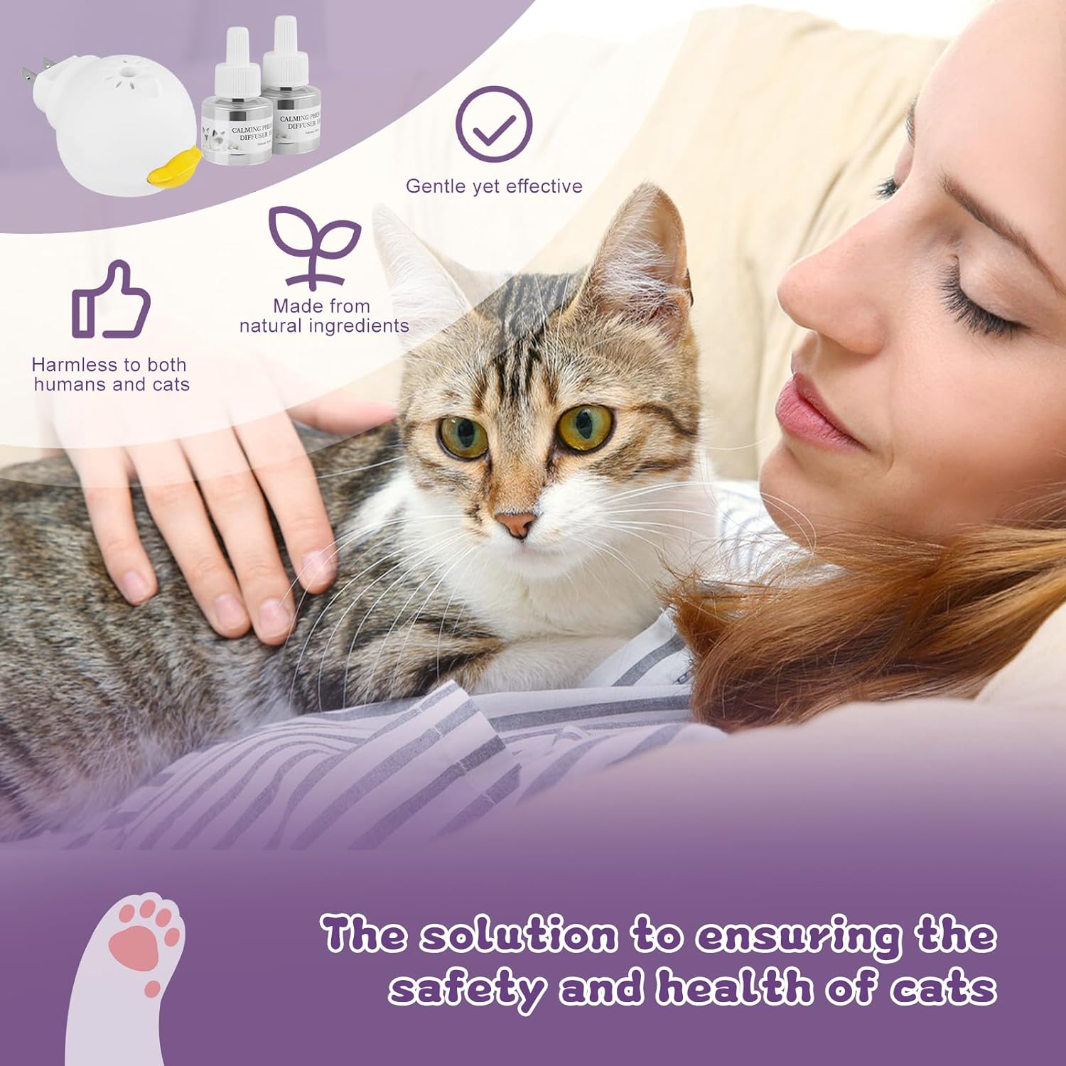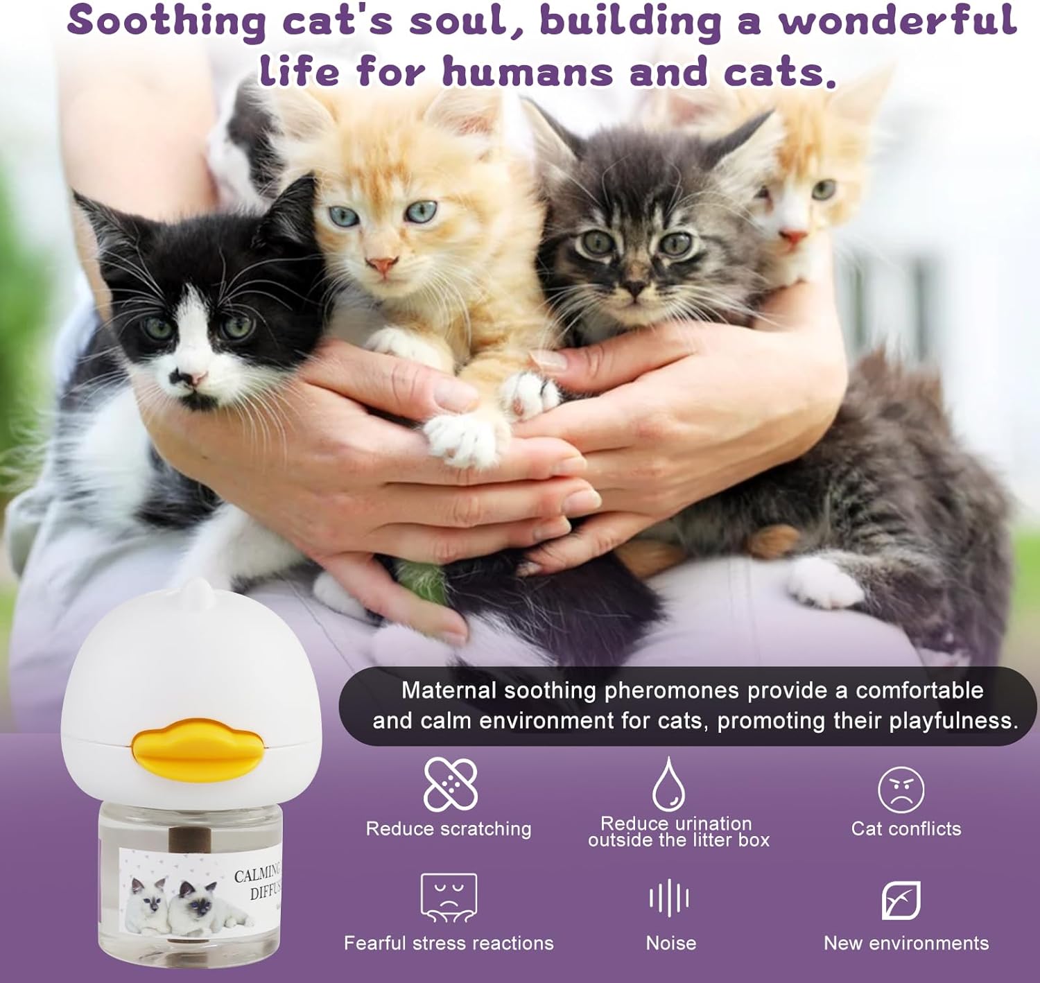 Pheromone diffuser for cats is specially formulated to help reduce cats' anxiety, reduce fights between cats, help maintain family harmony, and reduce conflicts between pets.