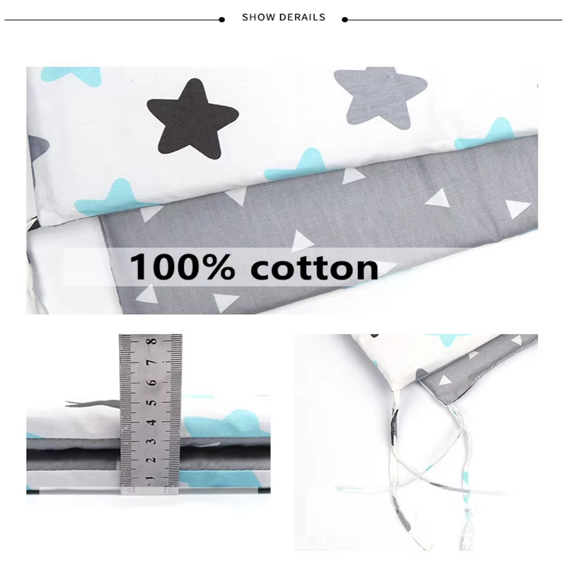 The bumpers are made of 100% cotton and breathable mesh, free from harmful chemicals.