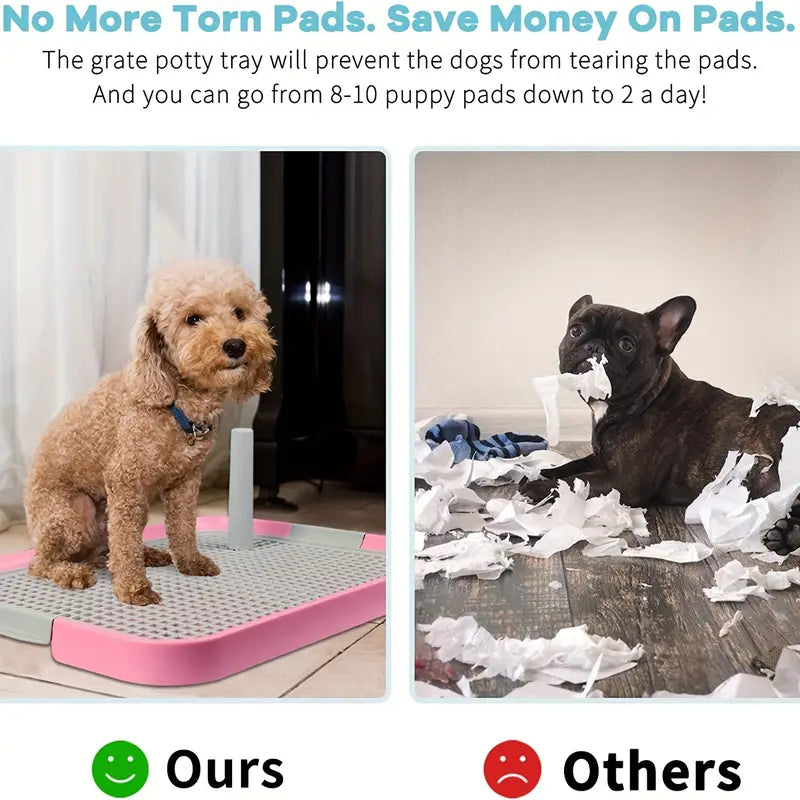 The innovative grate potty tray acts as a protective barrier, preventing dogs from tearing pee pads, reducing daily usage from 8-10 pads to just 2.