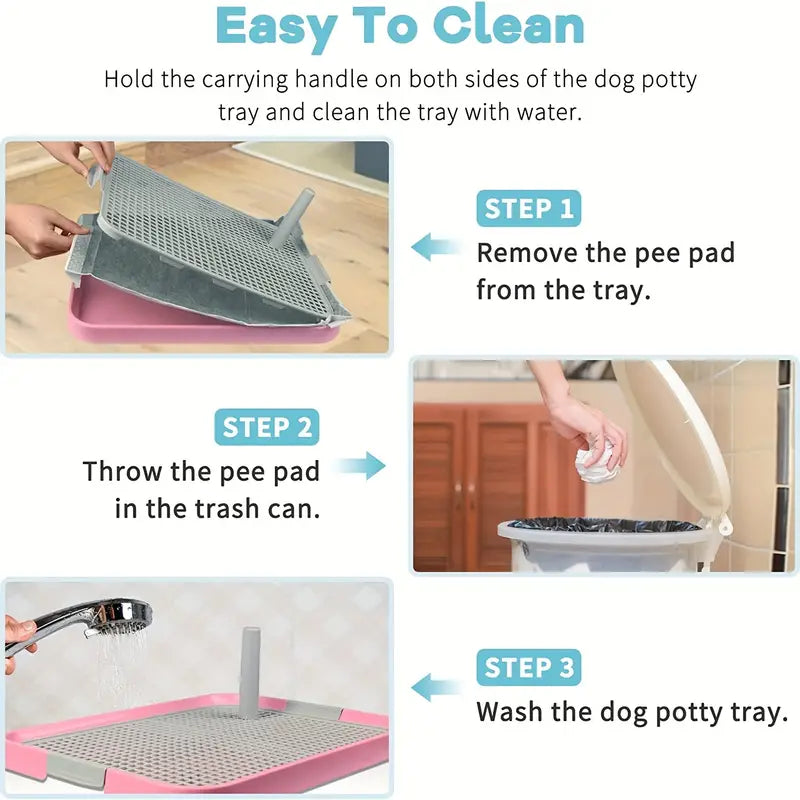 The removable post and carrying handles make cleaning a breeze. Just follow the three simple steps – remove the pee pad, dispose of it, and wash the tray for a mess-free experience.