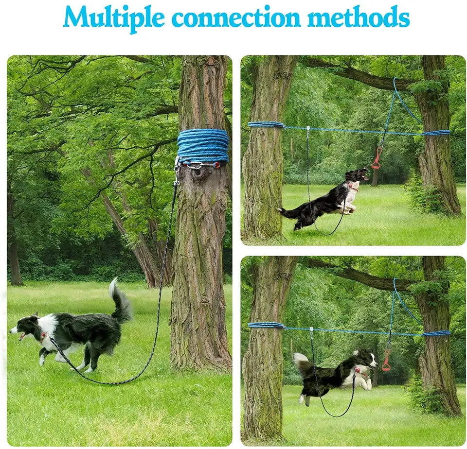 Easy To Install And Remove: The portable dogs trolley system is specially designed for dog outside activities and can be quickly set up or takedown by one person within 5 minutes. Set it up between two trees or other anchor points, so that your dog can better train or relax in the yard camping outdoors. The dog runner for yard is only 1.76 lbs and comes with a portable bags for carrying and storage, you can easily take it out and carry it anywhere.