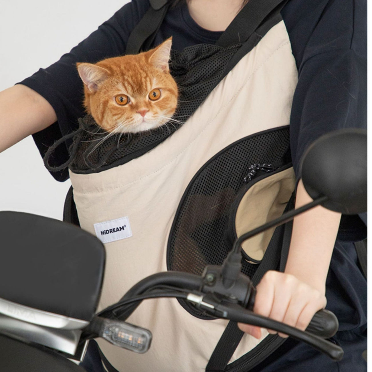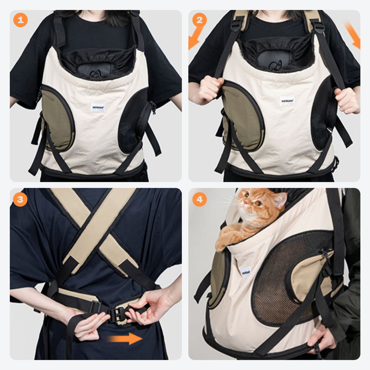 A: The ergonomic 4-step wear process is simple. Carry the bag on your chest, tighten the shoulder buckles, fasten the waist strap, and place your pet inside.