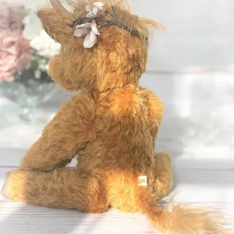 As well as having traditional cotter pin joints (so all limbs and head move), It include wired ears and English glass eyes. The horns are handmade from polymer clay.