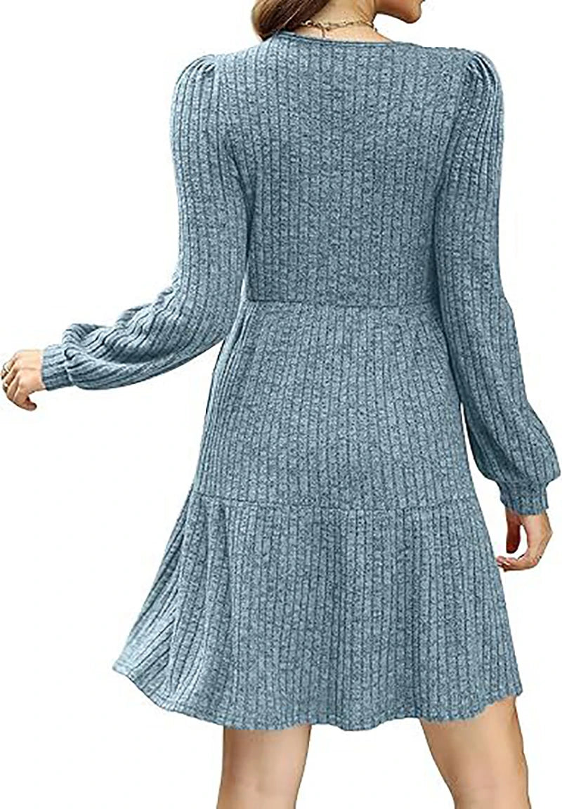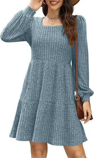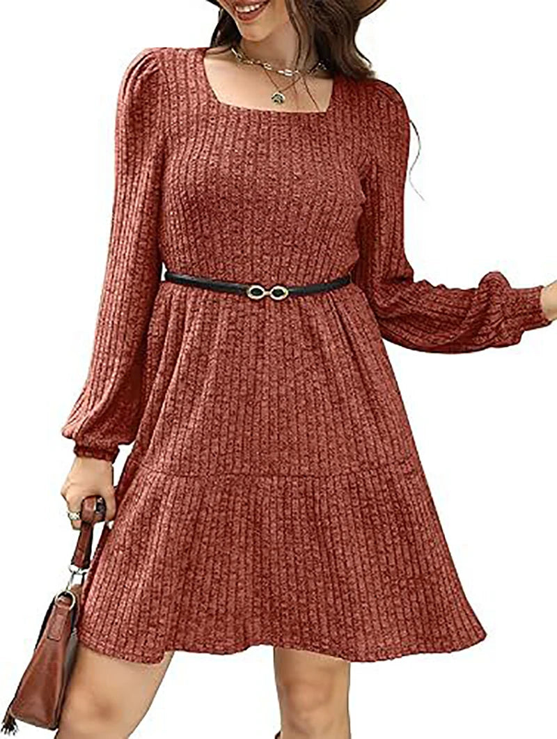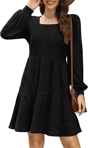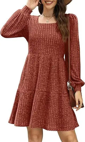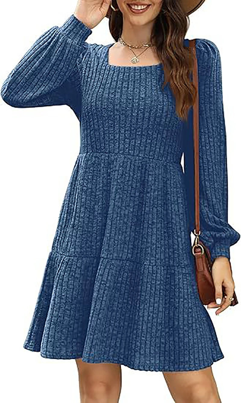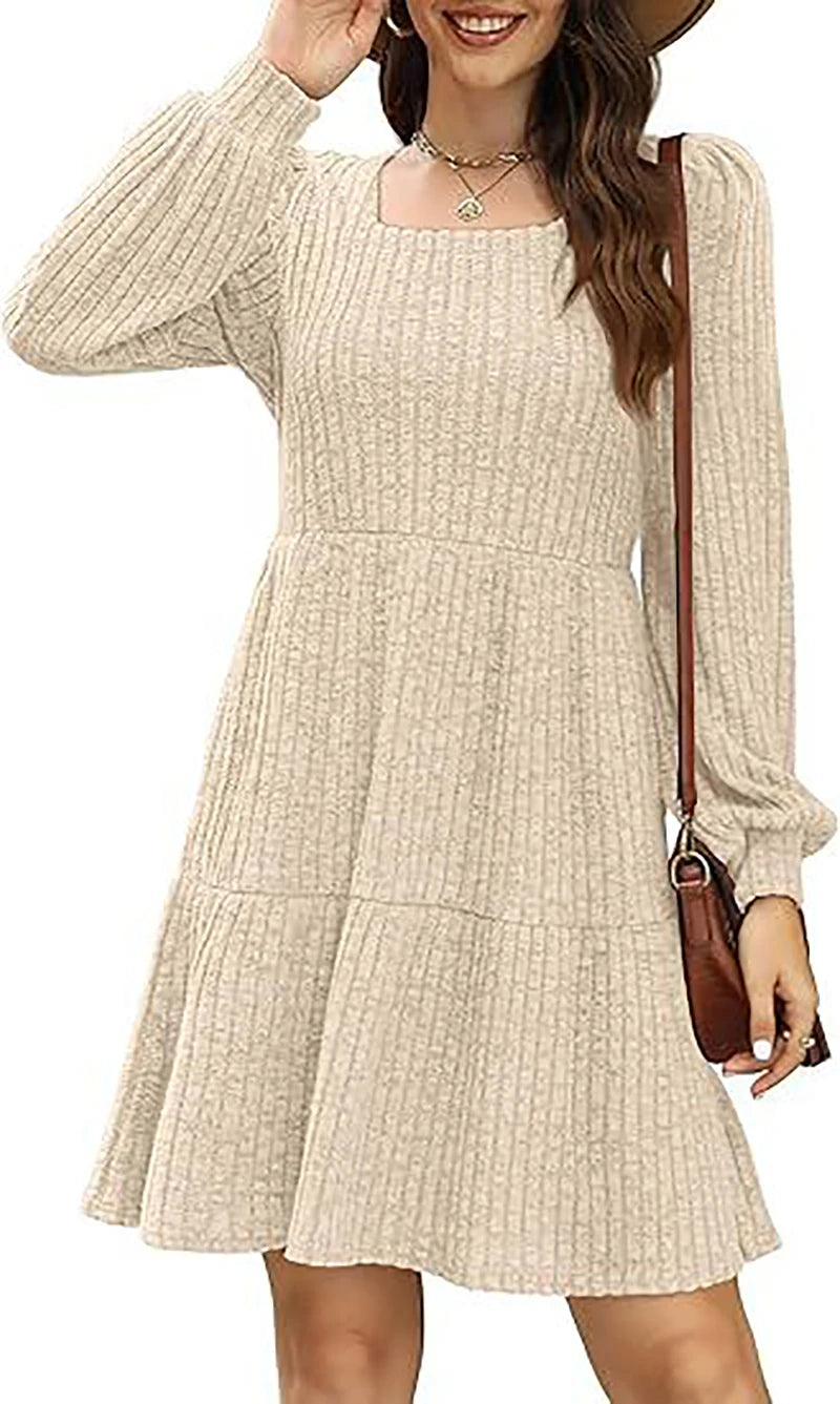 Womens Square Neck Long Sleeve Fall Tunic Dresses Casual Babydoll Sweater Dress with Pockets
