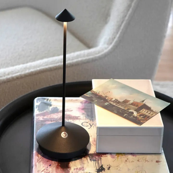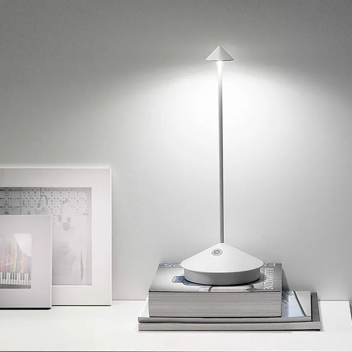 It's a rechargeable and dimmable table lamp for 13+ hours cordless illumination, with aluminum body and 2.2W LED light source that emits a luminous flux of 185 lumens, with 2700K warm light.