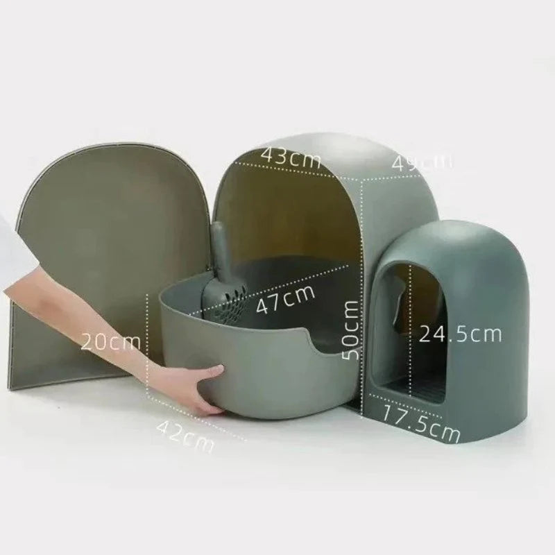 The MS Modern & Chic Fully Enclosed Compact Cat Litter Box offers a spacious, leak-proof, and odor-free design. Its large, removable, extra-high litter pan prevents leaking while making it easy to scoop and replace litter. The enclosed space ensures that there is no tracking of litter, thanks to the detachable side platform entryway with a wave-like curved surface to catch reusable litter. The litter scoop is included and can be conveniently attached to the litter tray for easy cleaning.