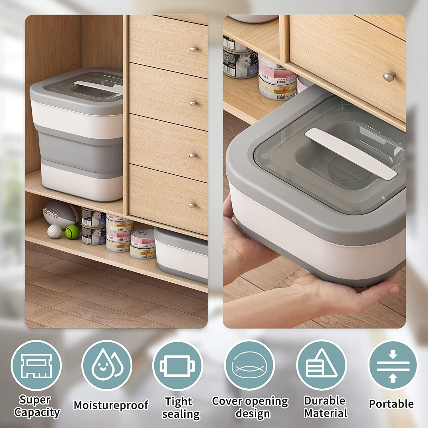 Portability is a key feature of our dog food storage container. Designed to be lightweight, it offers effortless mobility and convenience. Whether you're traveling, going on outdoor adventures, or simply rearranging your space, this portable container allows you to easily transport your pet's food wherever you go.