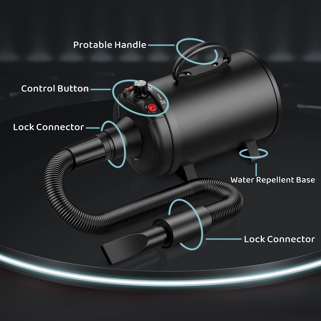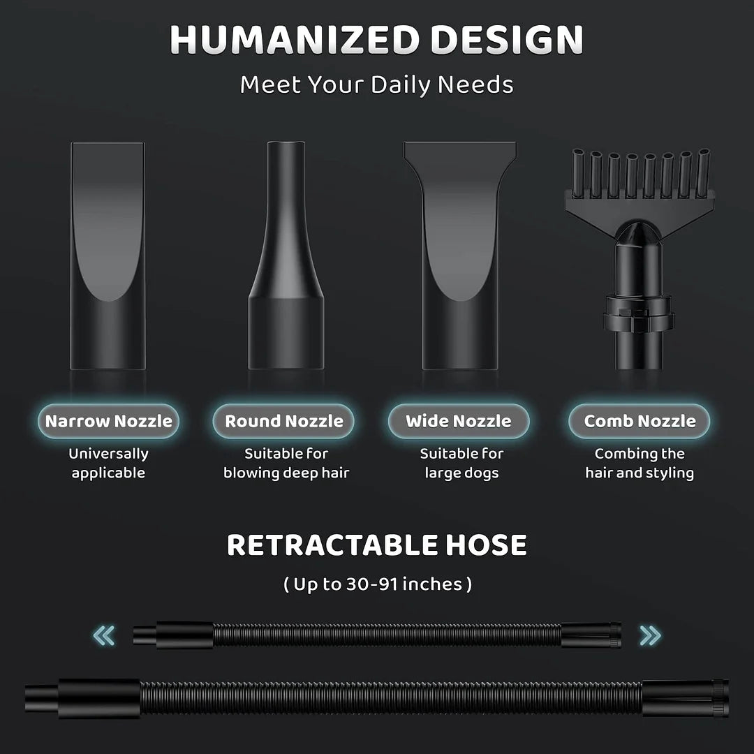 - MULTIPLE AIR OUTLETS - Our dog dryer comes with 4 air outlets with distinct functions, each serving a unique purpose. Additionally, it includes a stretchable rubber grooming hose that extends from 25.6" to 78.7".