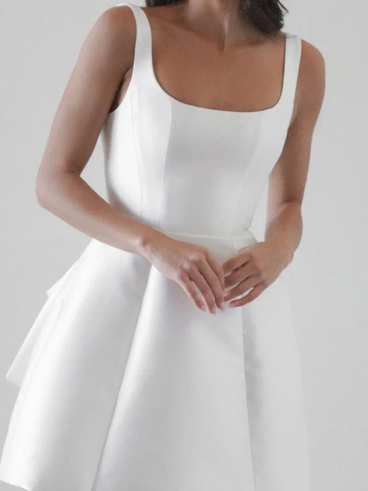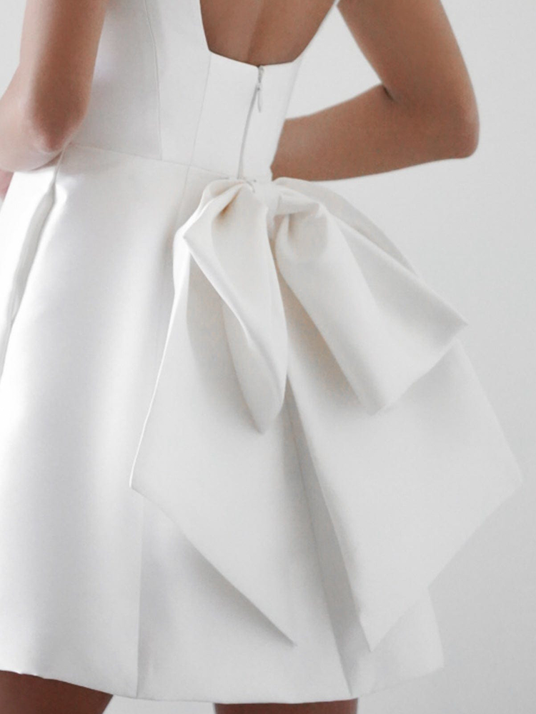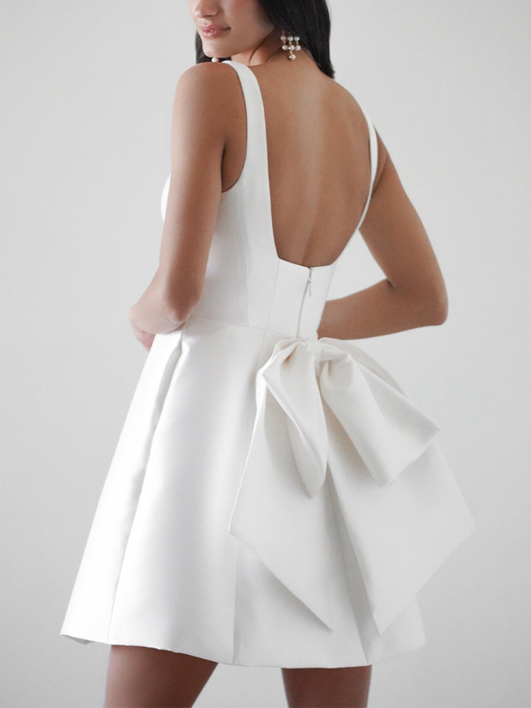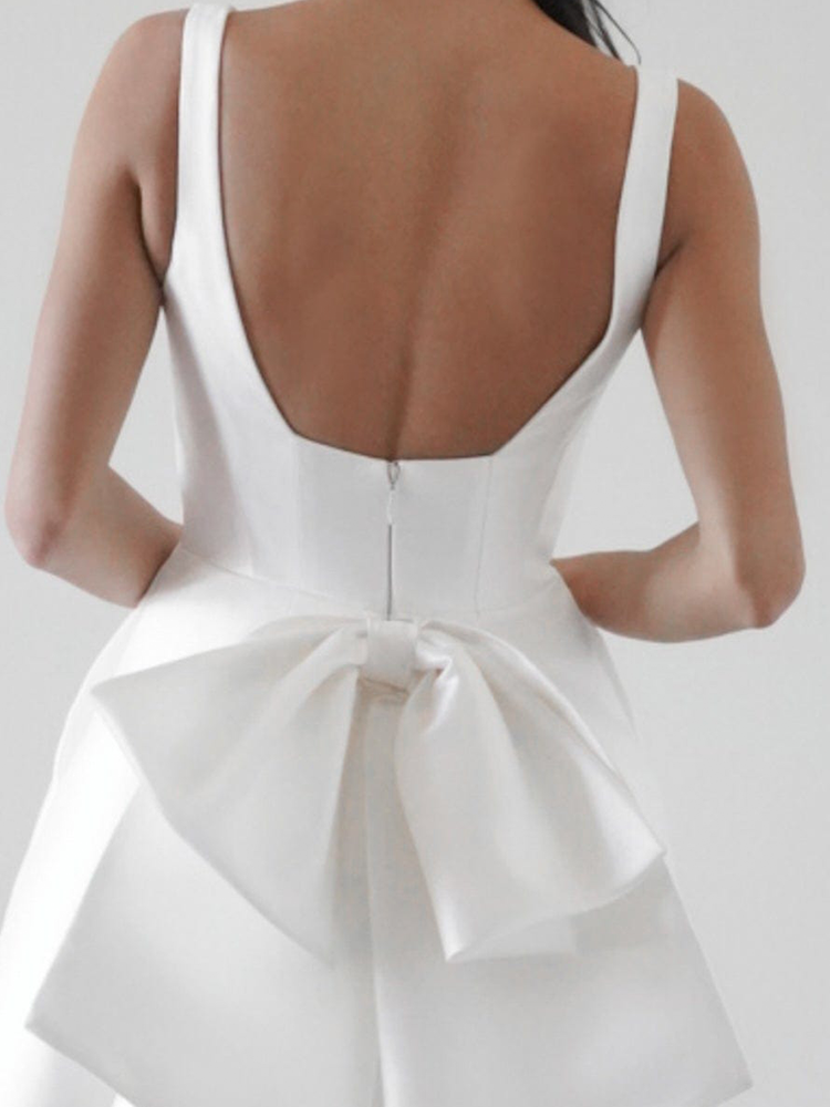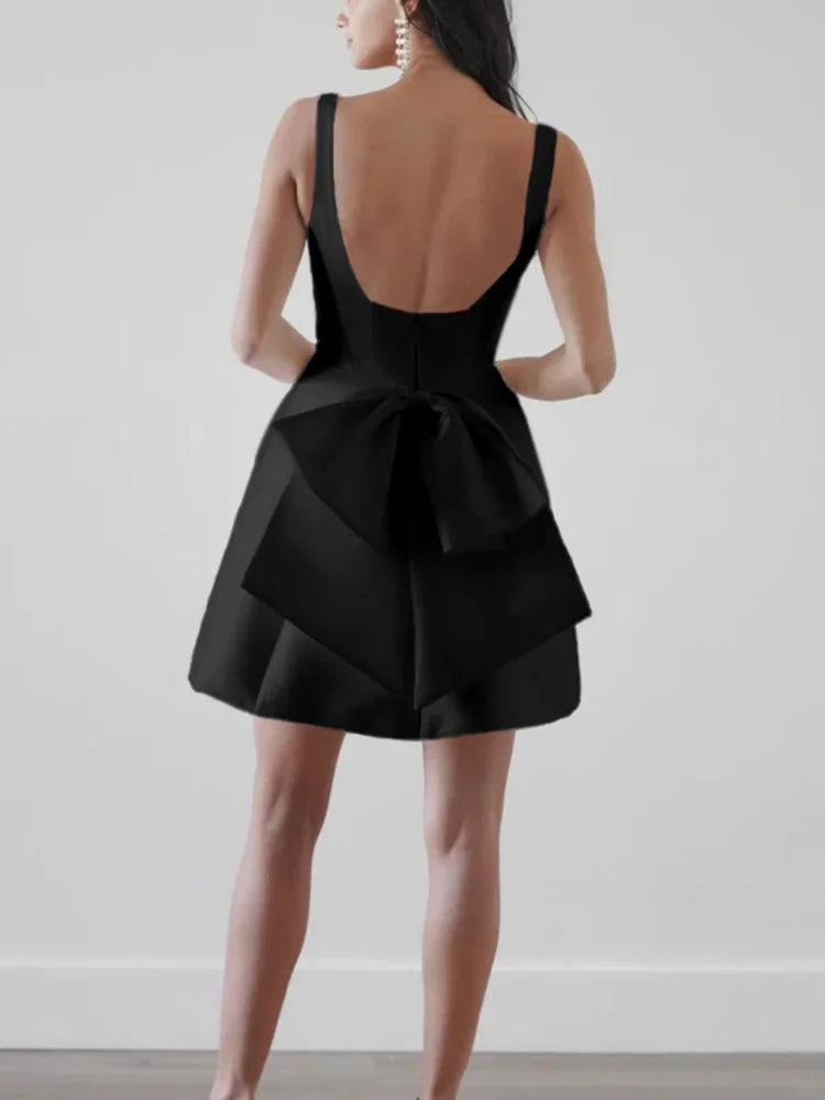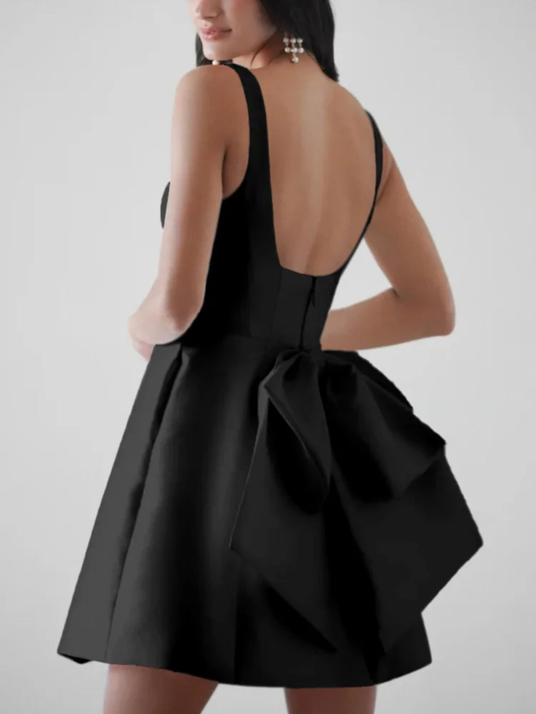 This satin square neckline waist cinching mini dress enhances your party look. Featuring luxurious satin fabric, the slim square neckline and waistband design aim to enhance your figure, while the backless and detachable bow design sets you apart. It is your best choice for attending parties or weddings.