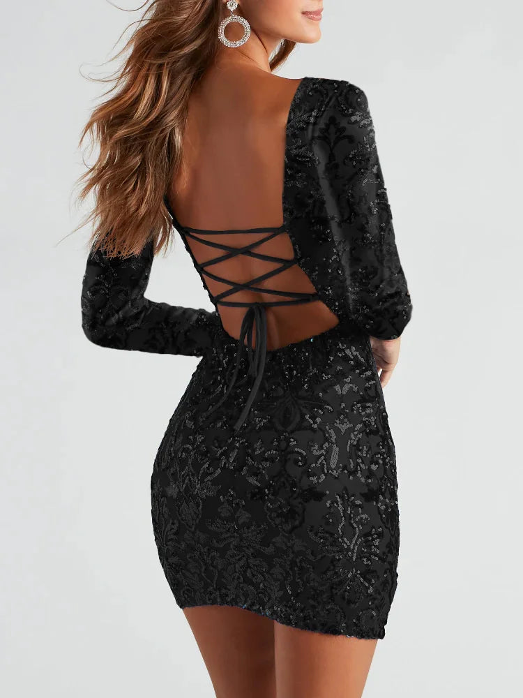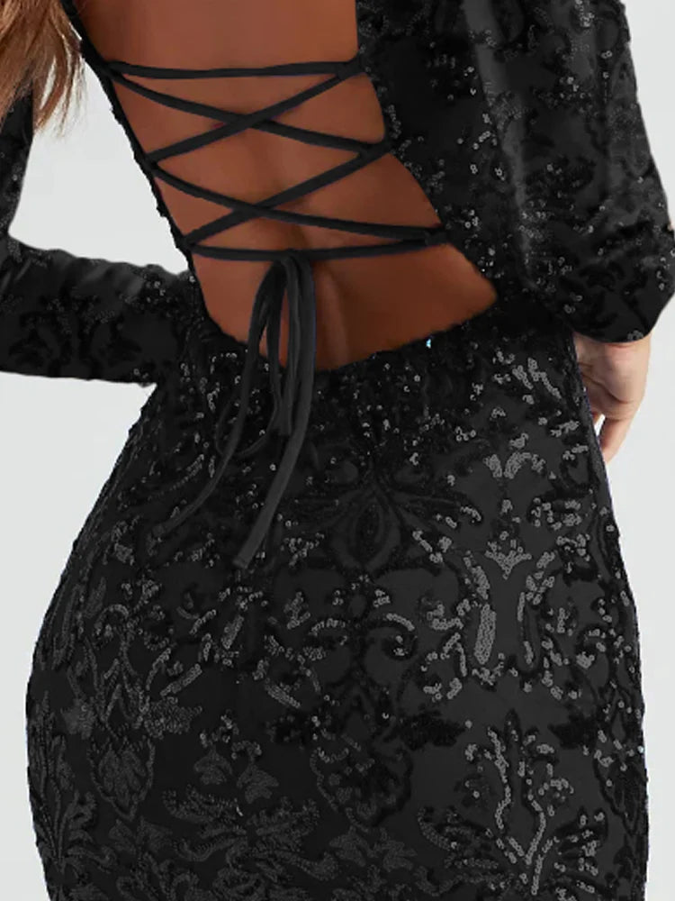 Sequin Long Sleeve Bodycon Lace-up Back Mini Dress