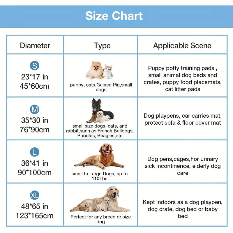 A: Yes, indeed. The pads are versatile and cater to various pets. The size chart includes options suitable for cats, small dogs, rabbits, and other small animals. They serve as comfortable mats, litter pads, or even cozy beds for your beloved pets.
