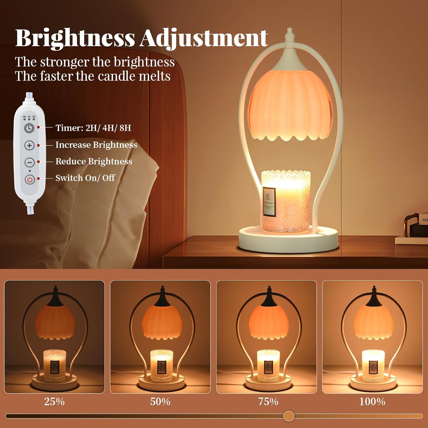 Create the perfect ambiance with the dimmable candle warmer lamp, featuring 2H/4H/8H timer settings and four adjustable brightness levels. Easily control the melting speed and fragrance intensity to match your mood. The timer ensures you never forget to turn off the candle lamp, offering convenience and peace of mind.
