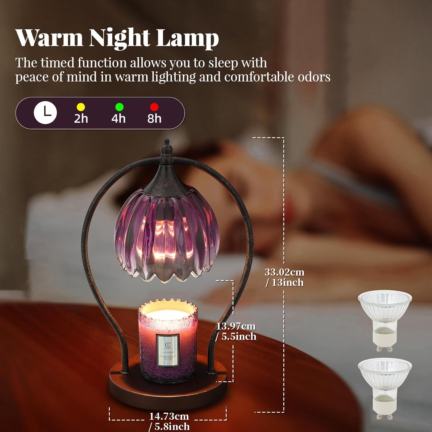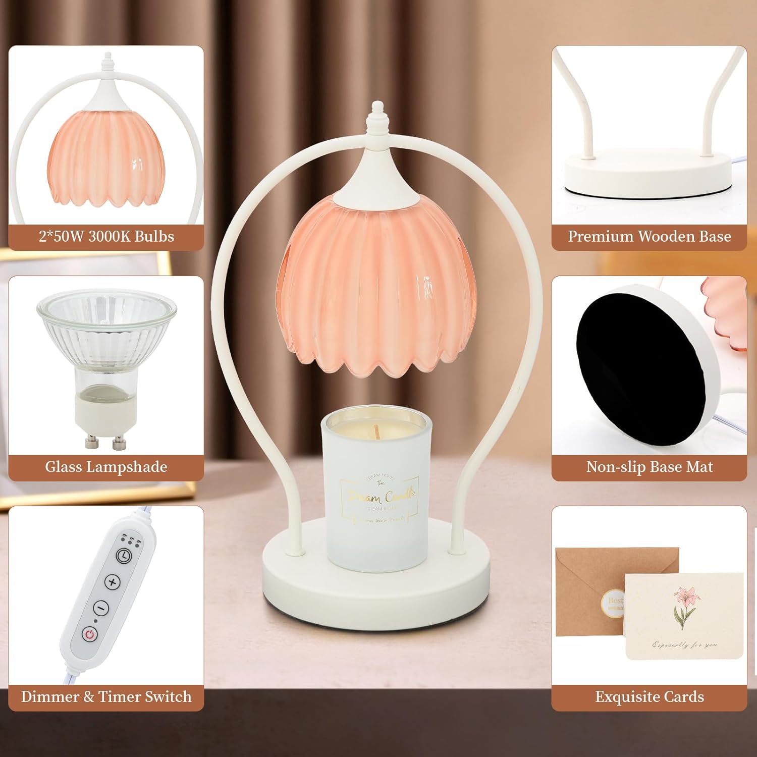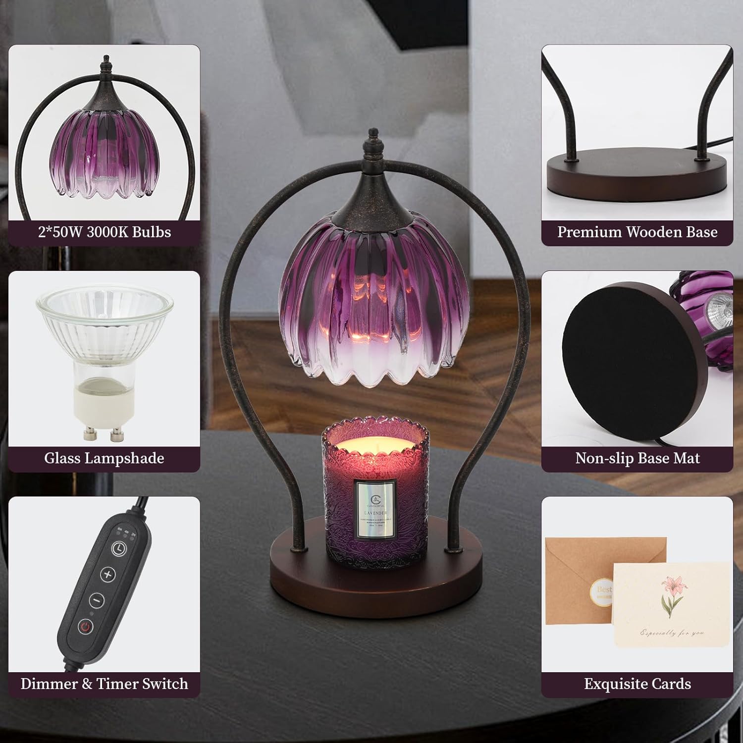 Experience peace of mind with the our timer candle warmer lamp, featuring a 50-watt halogen bulb (included) that melts candles without an open flame, smoke, or soot. This ensures your precious candles, such as those with sentimental value, are preserved longer. Ideal for homes with children or pets, this candle warmer offers a safer, cleaner, and more efficient alternative to traditional candle burning.