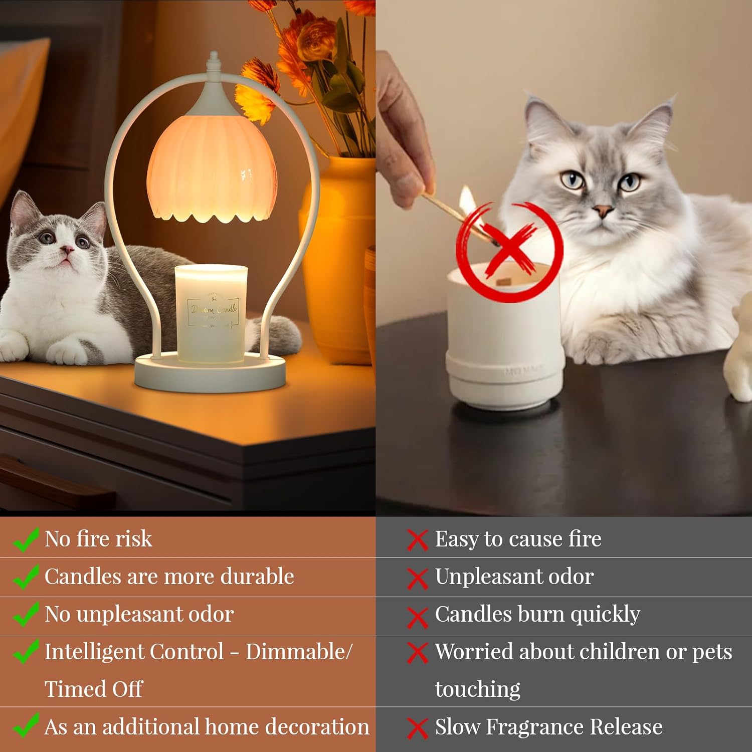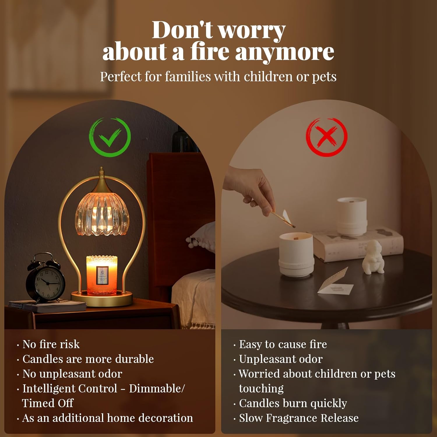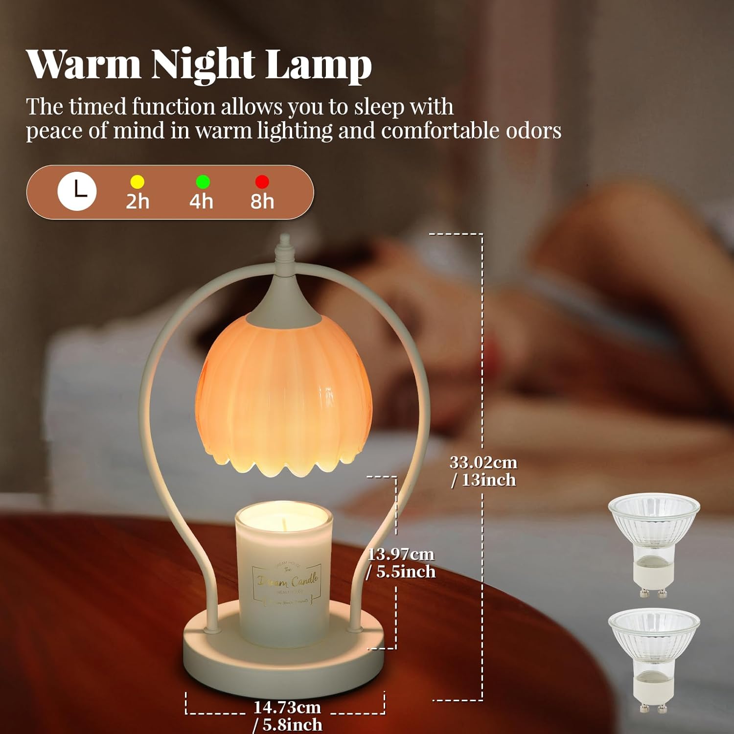 Experience peace of mind with the our timer candle warmer lamp, featuring a 50-watt halogen bulb (included) that melts candles without an open flame, smoke, or soot. This ensures your precious candles, such as those with sentimental value, are preserved longer. Ideal for homes with children or pets, this candle warmer offers a safer, cleaner, and more efficient alternative to traditional candle burning.