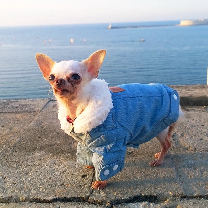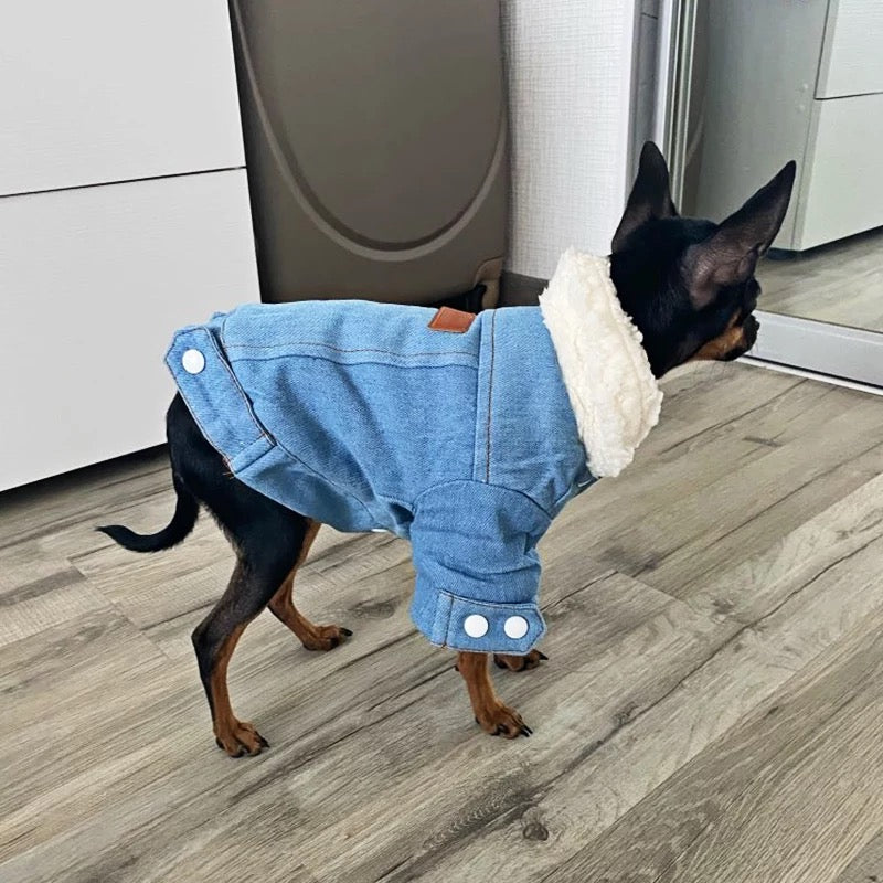 Crafted with comfort and fashion in mind, this jacket combines the timeless look of denim with soft fleece lining to provide your dog with the ultimate winter wardrobe staple. The durable denim exterior offers a classic aesthetic, while the plush fleece interior ensures warmth and comfort. Whether your pup is out for a walk or lounging indoors, this jacket is designed to keep them snug and stylish throughout the winter season. Upgrade your dog's winter fashion with our Winter Fleece Denim Dog Jacket!