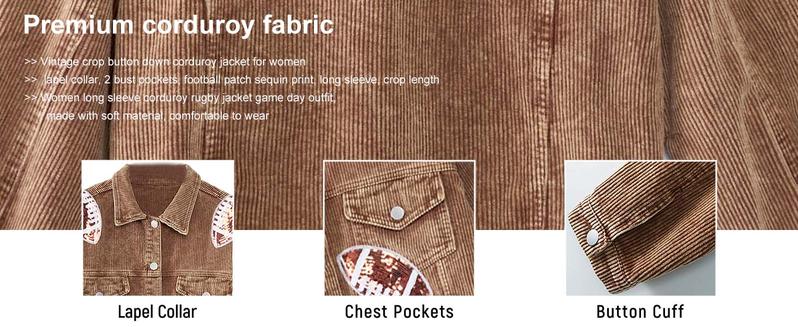 Women's Game Day Corduroy Sequin Football Cropped Jacket Rugby Oversized Lapel Button Down Shirt Shacket Coat