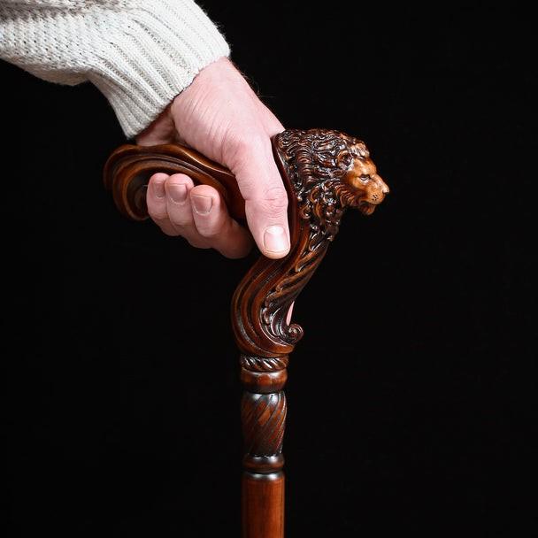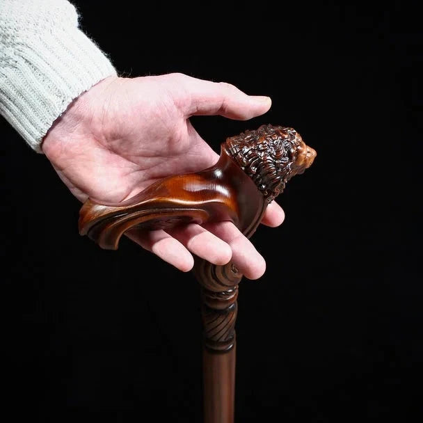 Wooden Walking Stick Cane Lion Head – Palm Grip Ergonomic Handle